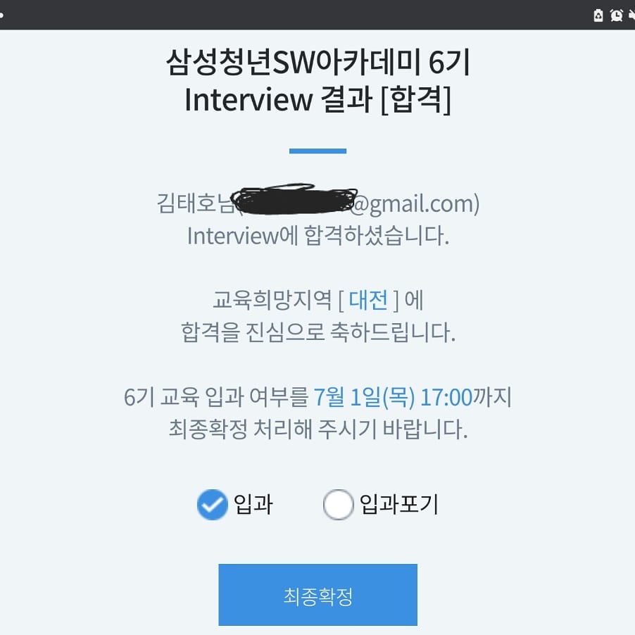 그러다 결과발표 문자가 왔다. 불합격 이라는 글자를 볼 마음의 준비를 하면서 결과 확인 페이지에 들어갔는데 웬걸, 합격 글씨를 보았다.