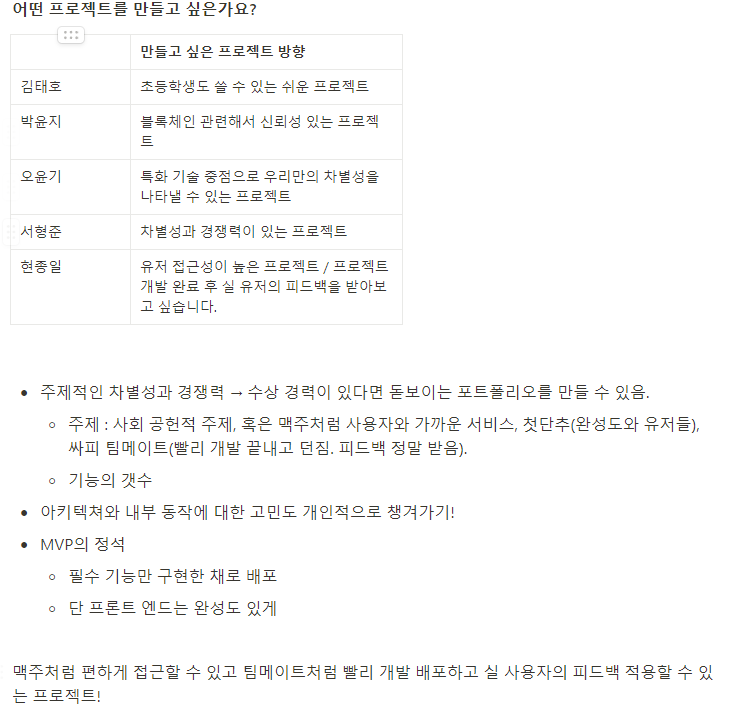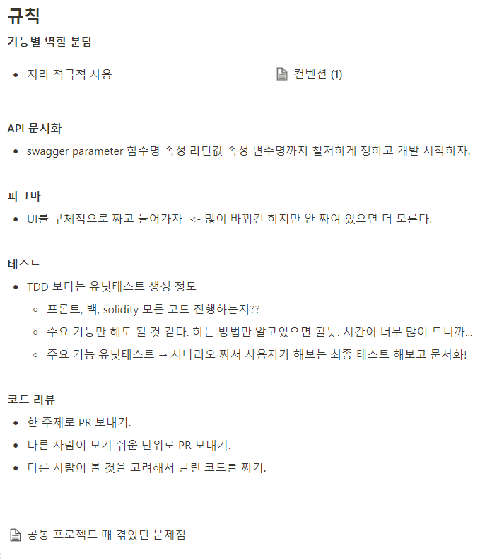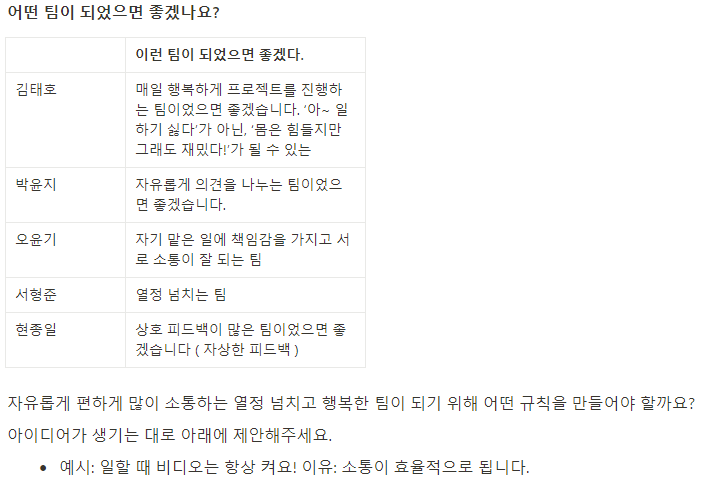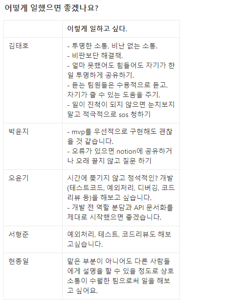 아래는 팀이 구성된 첫 날 공동의 목표를 공유하고 팀 규칙을 정하기 위해서 논의한 것들이다.