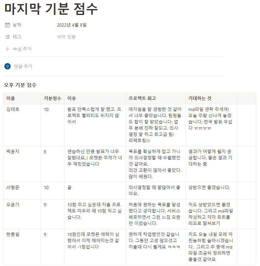 하지만 다들 솔직하고 정확하게 의사표현을 해주었다.