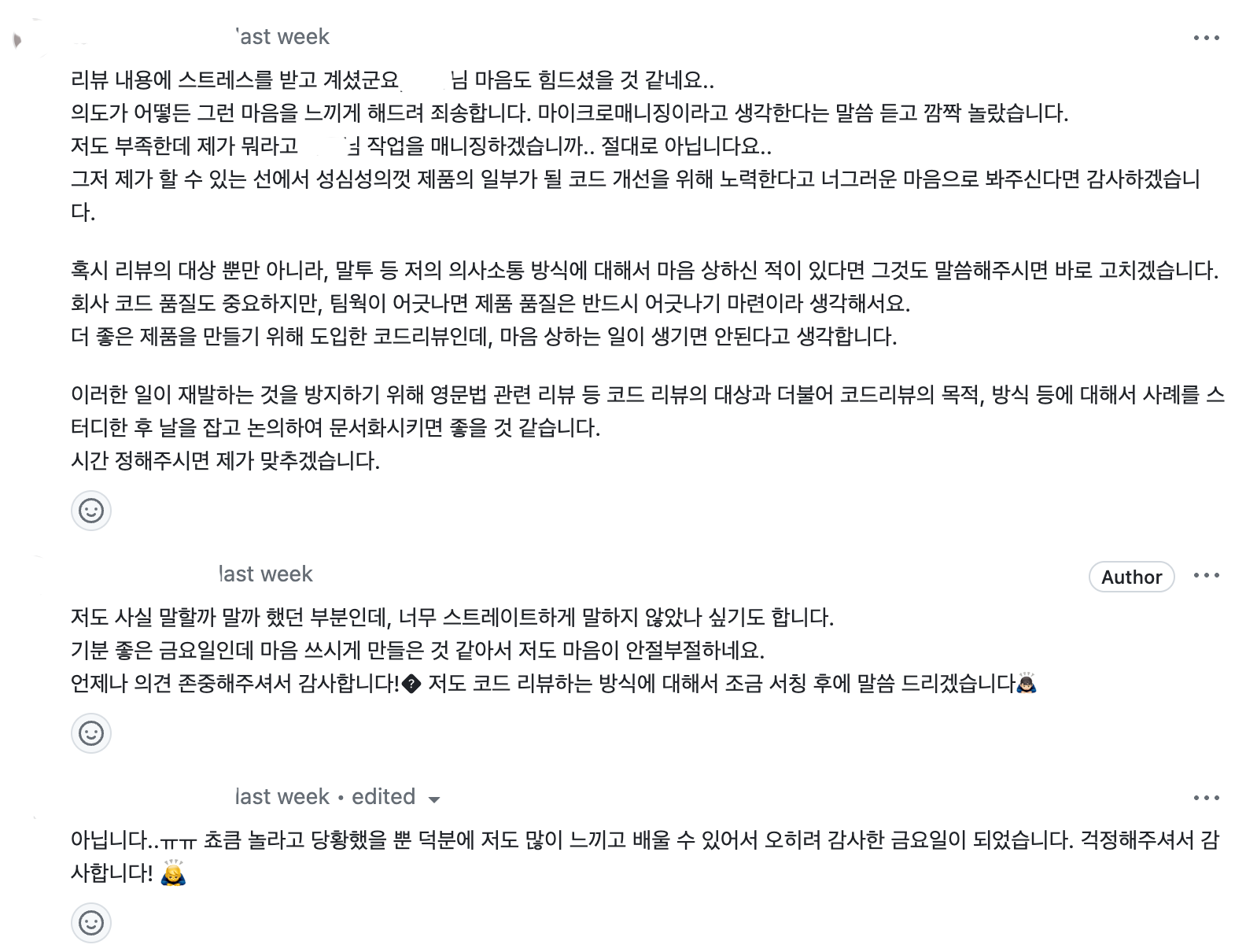 코드 리뷰 목적에 관한 공감대가 형성되지 않았다고 판단한 계기는 아래 사건을 통해서였다.