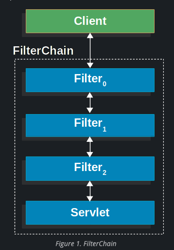 클라이언트는 앱에 요청을 보낸다. 그리고 컨테이너는 FilterChain을 만든다. 그것은 Filter 인스턴스를 담고 있다. 그리고 서블렛을. 서블렛은 요청 URI의 path에 따라 HttpServletRequest를 진행해야 한다. 스프링 MVC 애플리케이션에서 서블렛은 DispatcherServlet의 인스턴스이다. 대개 하나의 서블렛은 하나의 HttpServletRequest와 HttpServletResponse를 핸들링할 수 있다. 그러나 아래의 경우에 둘 이상의 필터가 쓰일 수 있다.