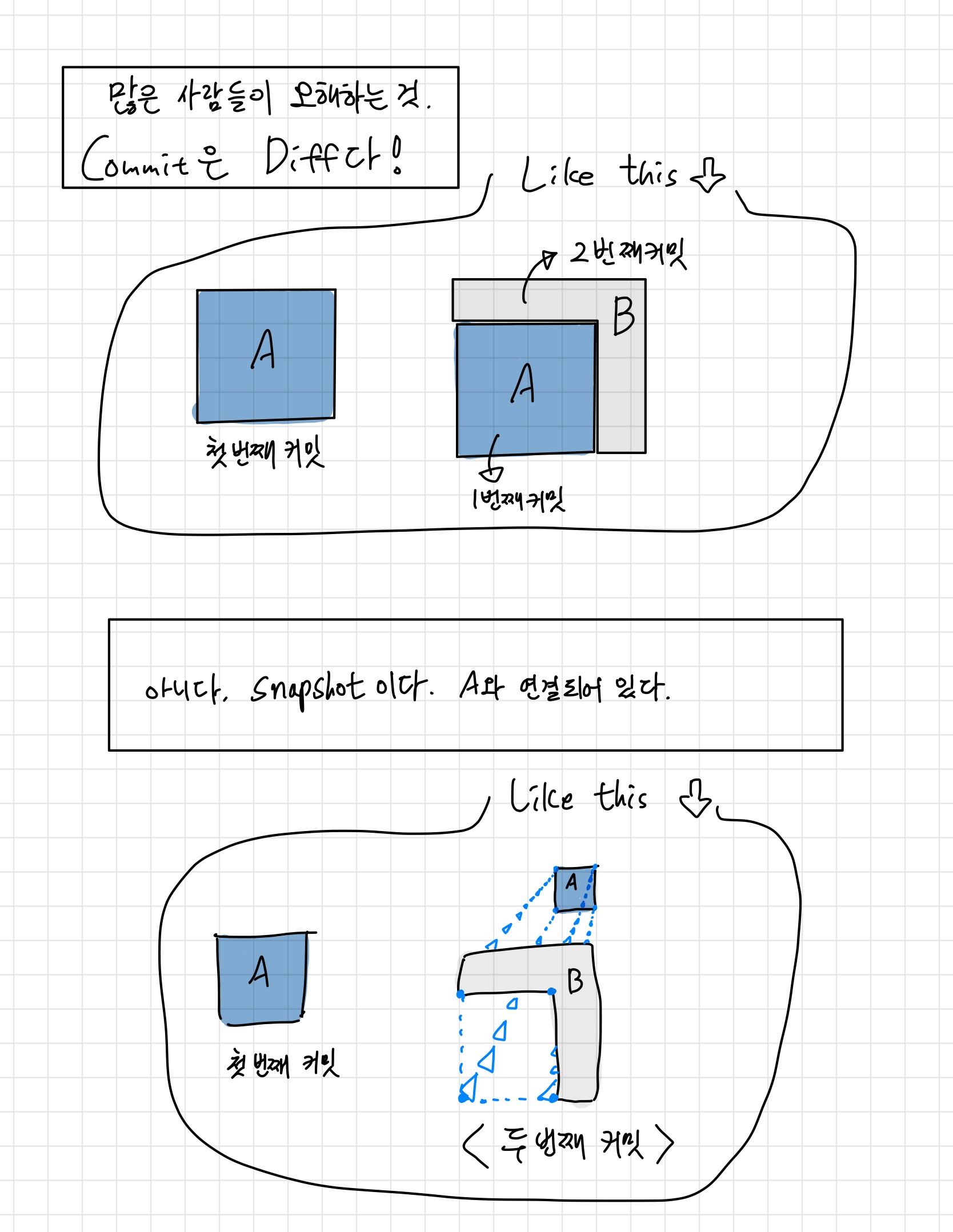 커밋은 단순한 스냅샷이 아니라 전 스냅샷들과 긴밀히 연결되어있는 3d 퍼즐처럼 생긴 스냅샷이었던 것이다.