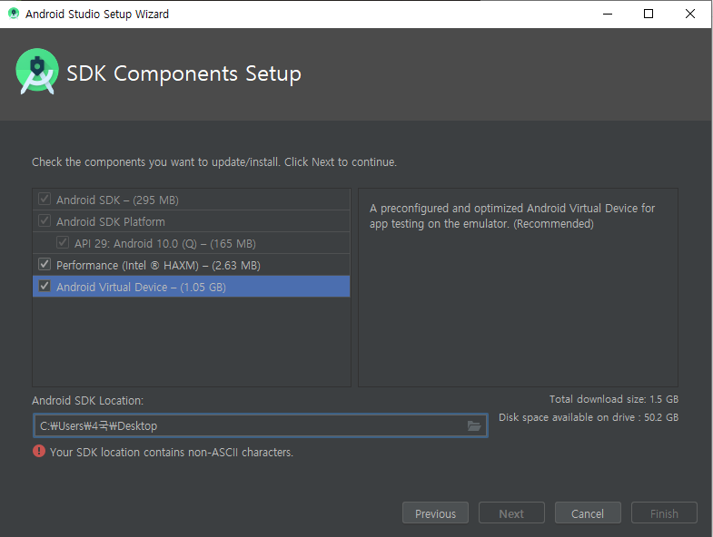 빨간색 느낌표와 함께 your sdk location contains non-ascii character 라는 오류문구가 뜨면서