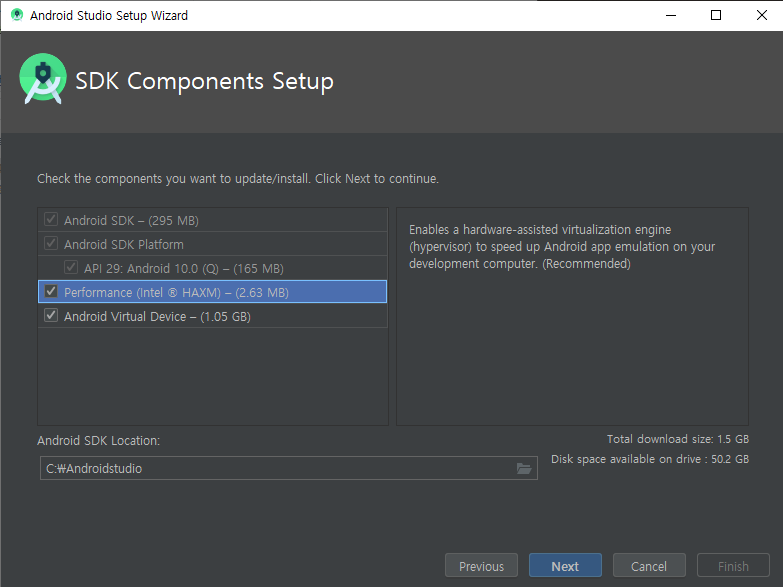 필자는 C드라이브 밑에 Androidstudio라는 폴더를 따로 만들어서 설치를 했다.